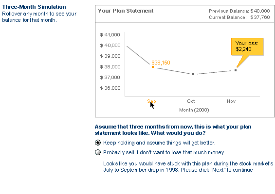 Using the Asset Mix you chose in Step 3 and your actual current account balance, we'll run your plan through some real-life bear-market scenarios. Let's see how you react. | |||||||