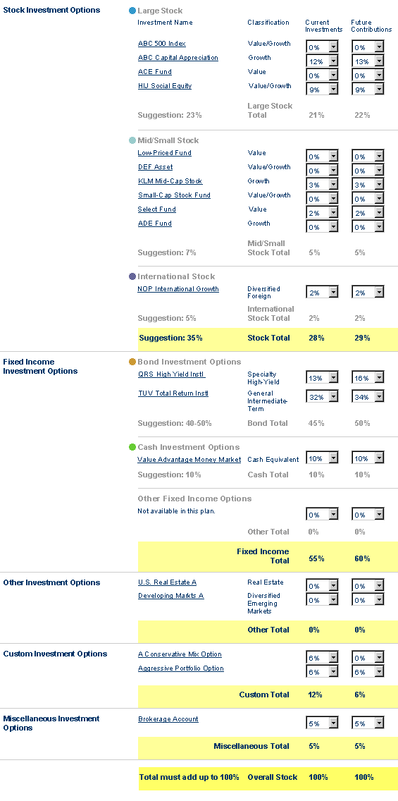 Your suggested asset mix applies only to investment options you are not restricted from selling. Any custom funds in your plan are also excluded from this investment mix. |